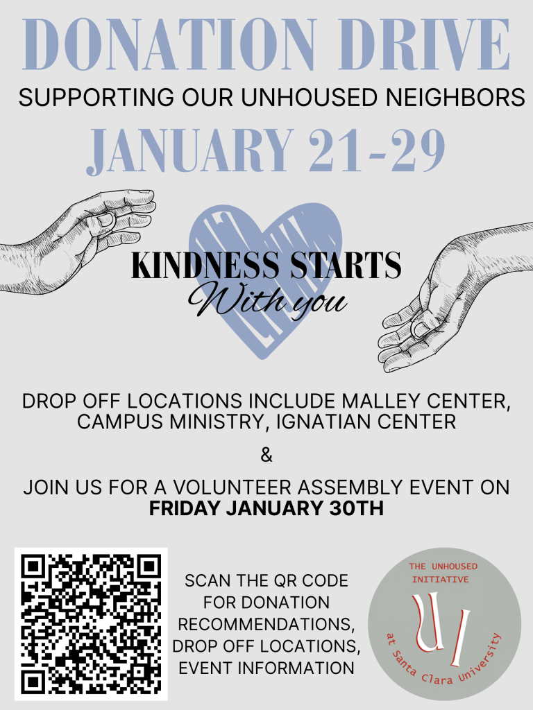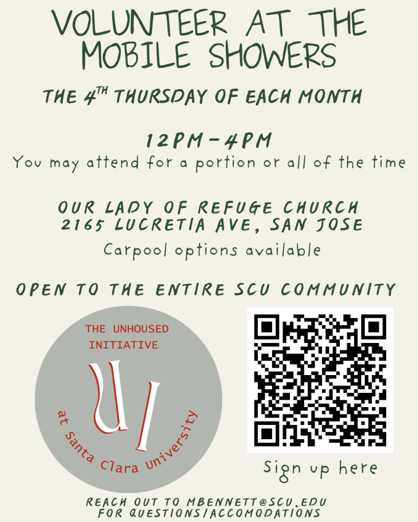 • Mobile Showers – Join us for a monthly service event at the showers on the 4th Thursday of the month. Open to all of the SCU Community. Click here to sign-up or email unhousedinitiative@scu.edu for more info!
