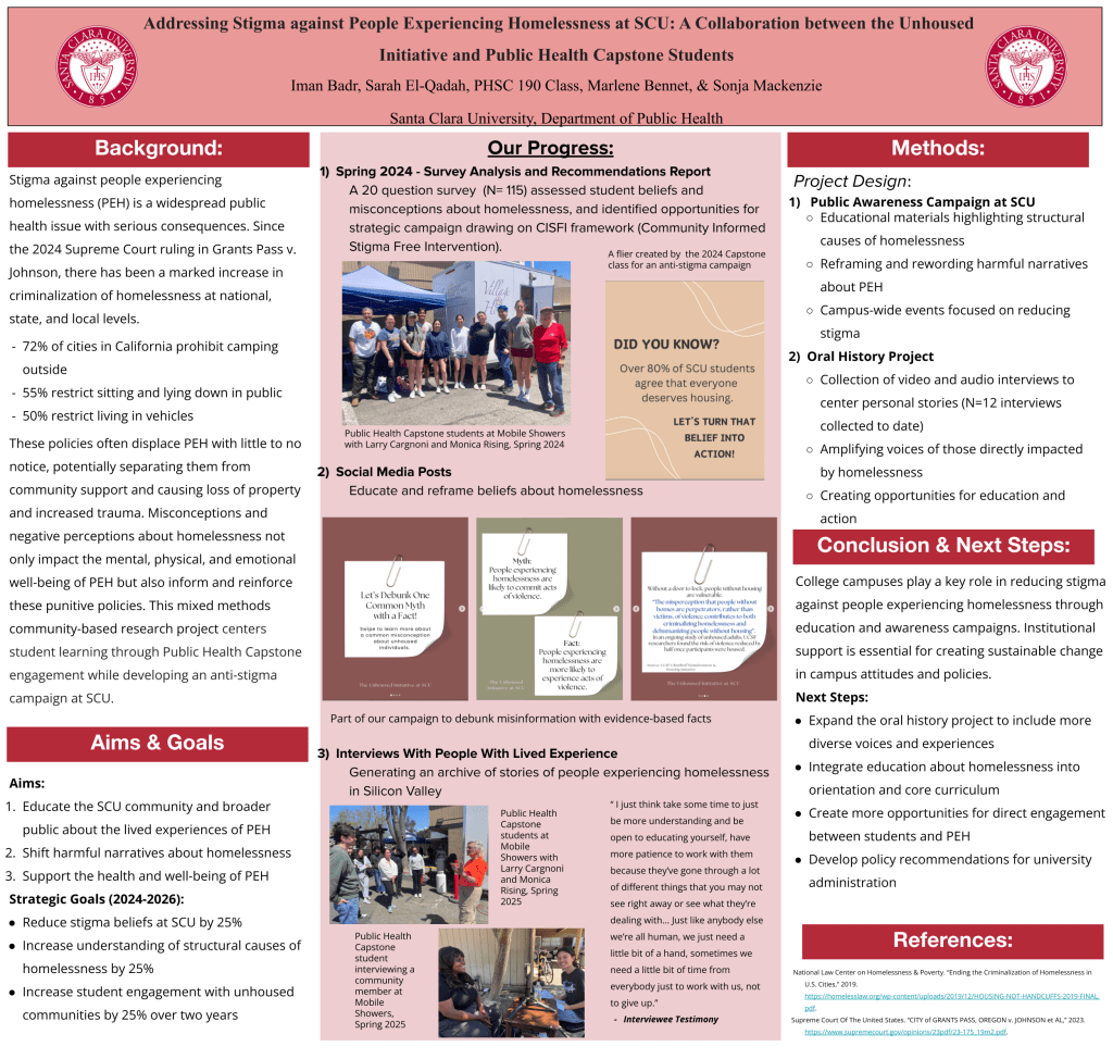 Sarah El Qadah’s poster titled “The Impact of Strategic Communication and Shifting Attitudes Surrounding Unhoused Individuals: A Student-Facing Anti-Stigma Campaign”Iman Badr’s poster titled “Addressing Stigma against People Experiencing Homelessness at SCU: A Collaboration between the Unhoused Initiative and Public Health Capstone Students”