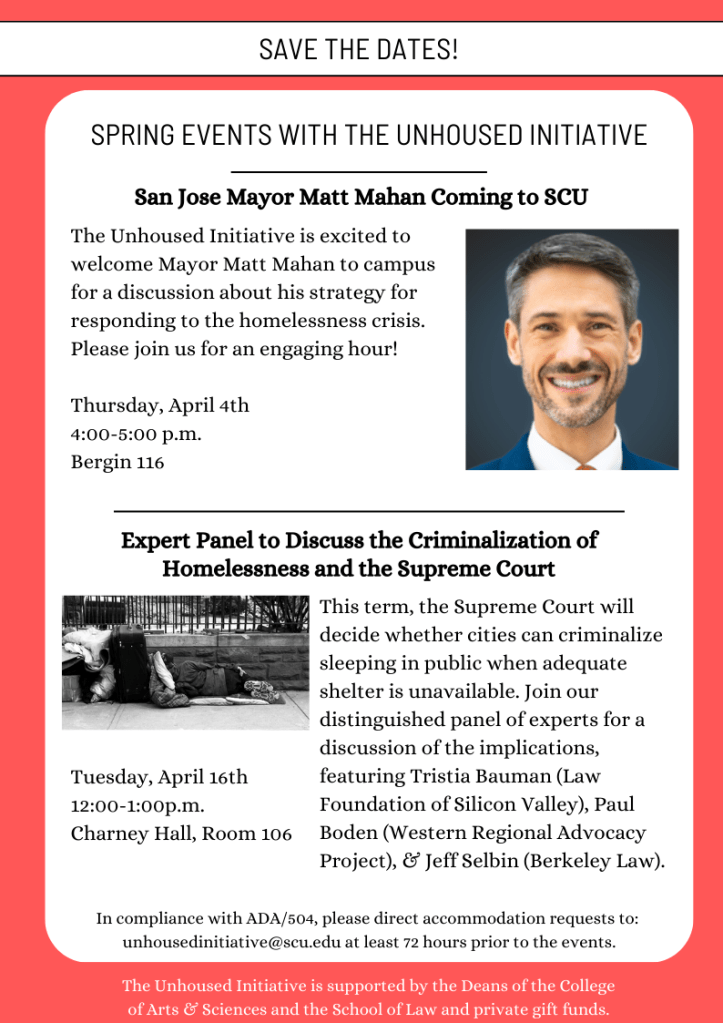 A noontime panel complemented the tombstone display. The panel discussed homeless mortality and the health and safety impacts of encampment sweeps. It was also a reflection on the sweep of the Jungle in 2014 and the community that resided there. Panelists included Shaunn Cartwright, creator of the Tombstone Memorial project, Robert Aguirre, member of the Gilroy Homeless Union, Todd Langton, Executive Director of Agape Silicon Valley, and Unhoused Initiative faculty member, Professor Boo Riley. The panel was the first in a year-long series examining encampment sweeps, past, present and future.