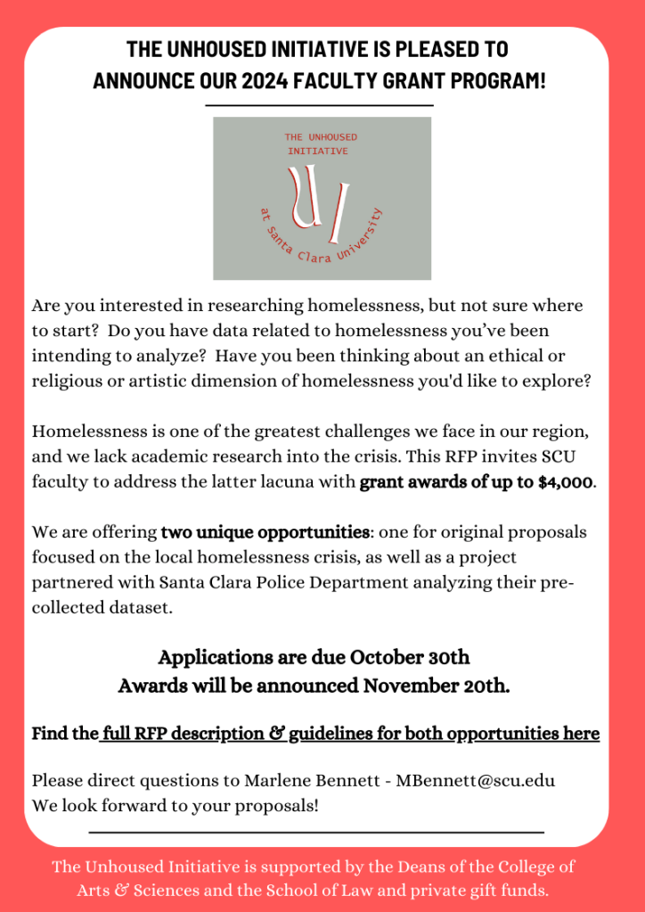 On November 18 and 19, the Unhoused Initiative hosted an outdoor art display of the Tombstone Memorial for our unhoused neighbors who died on the street in Santa Clara County this year. Each year, local activist, Shaunn Cartwright, makes a tombstone for each person who died while homeless in the County. A representative sample of the current 195 deaths this year (as of Nov. 18, 2024) were on the Kenna/Benson lawn to raise awareness on campus about homelessness and homeless mortality. It was also an opportunity to acknowledge the 10th anniversary of the sweep of The Jungle in San Jose – one of the largest encampments in the country at the time.